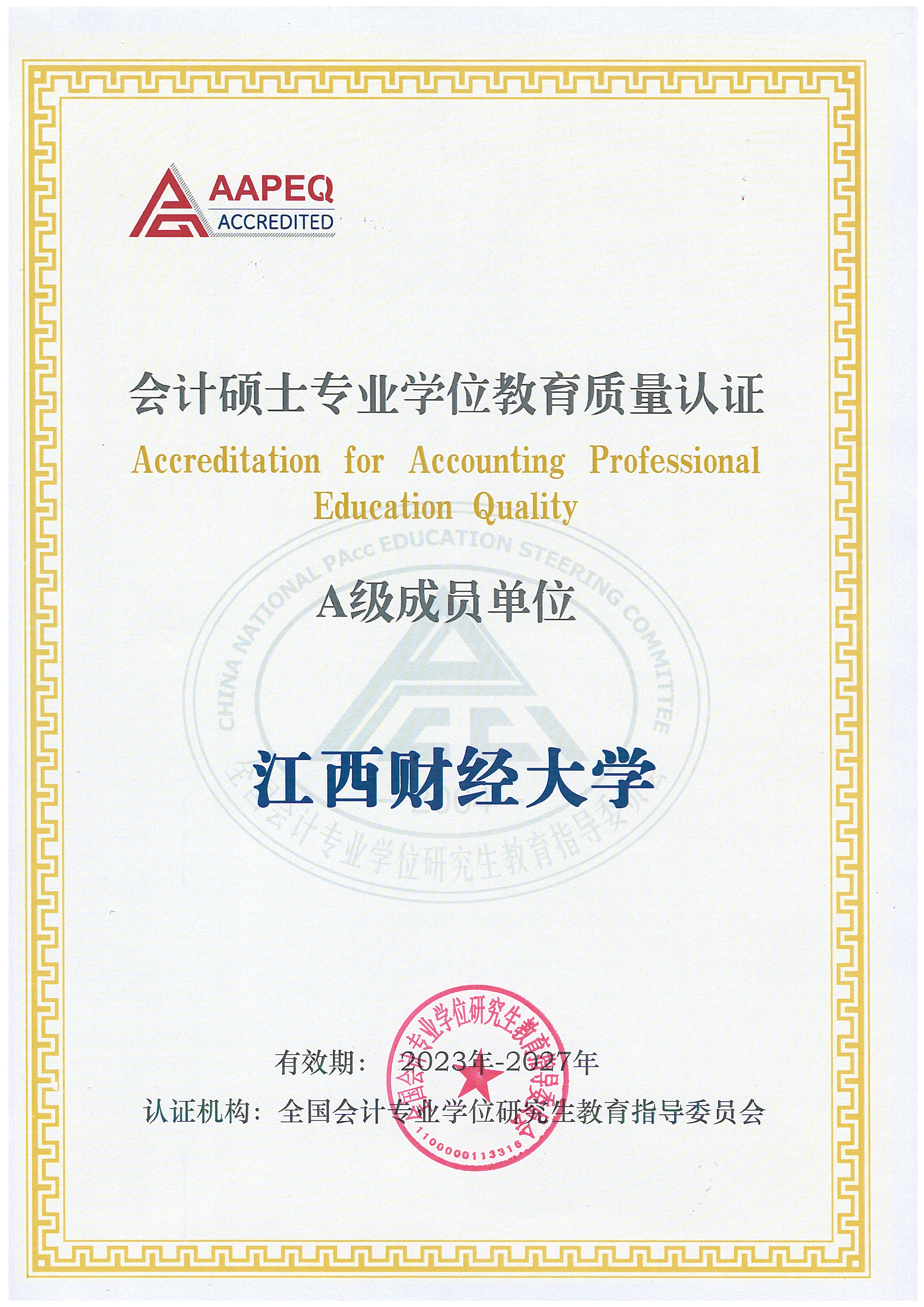 我校继2018年成为全国第二批AAPEQ认证A级成员单位后,再次获得最高等级A级认证结论,有效期5年。此次维持认证的获评,既是对江西财经大学会计硕士专业学位(MPAcc)项目改革建设、创新发展的充分肯定,也是对会计学院研究生人才培养工作的高度认可。(图文/会计学院 编辑/李贵超 审核/一审 姜莹 二审 赵旻 终审 李大晖)