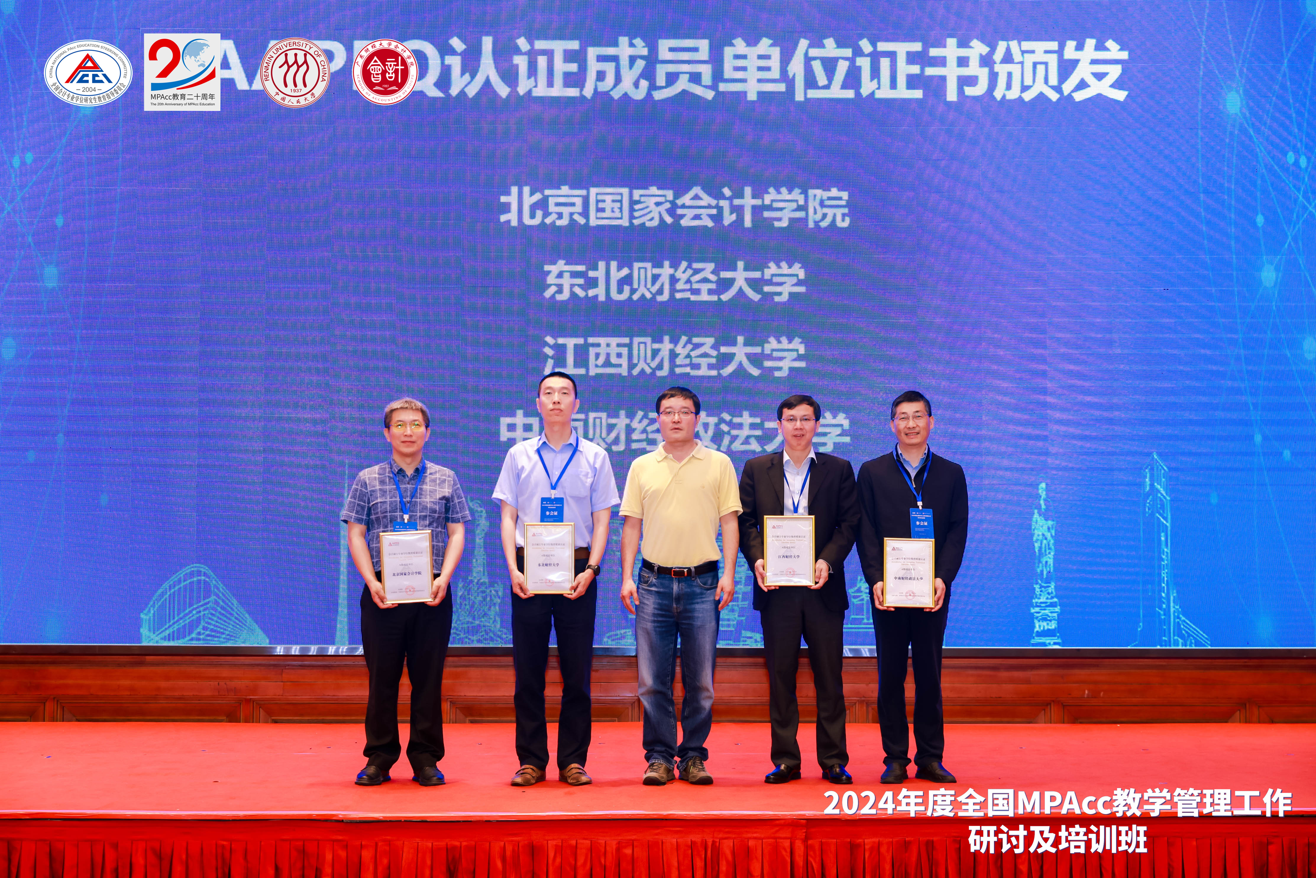 培训会上,会计教指委秘书长、中国人民大学支晓强教授为通过会计专业学位教育质量认证(AAPEQ)再认证的北京国家会计学院、东北财经大学、江西财经大学、中南财经政法大学以及首次通过AAPEQ认证的重庆大学颁发AAPEQ认证A级成员单位证书。