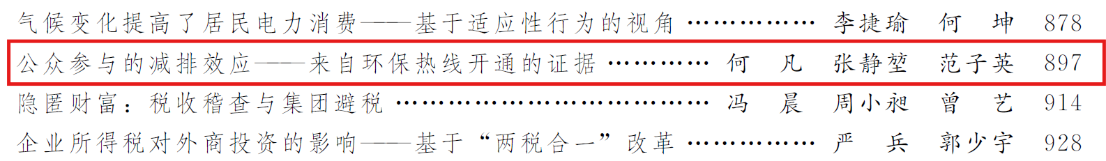 近日,财税与公共管理学院何凡博士合作的研究成果《公众参与的减排效应—来自环保热线开通的证据》在我校权威A类期刊《经济学(季刊)》第24卷第3期(总第100期)正式发表。