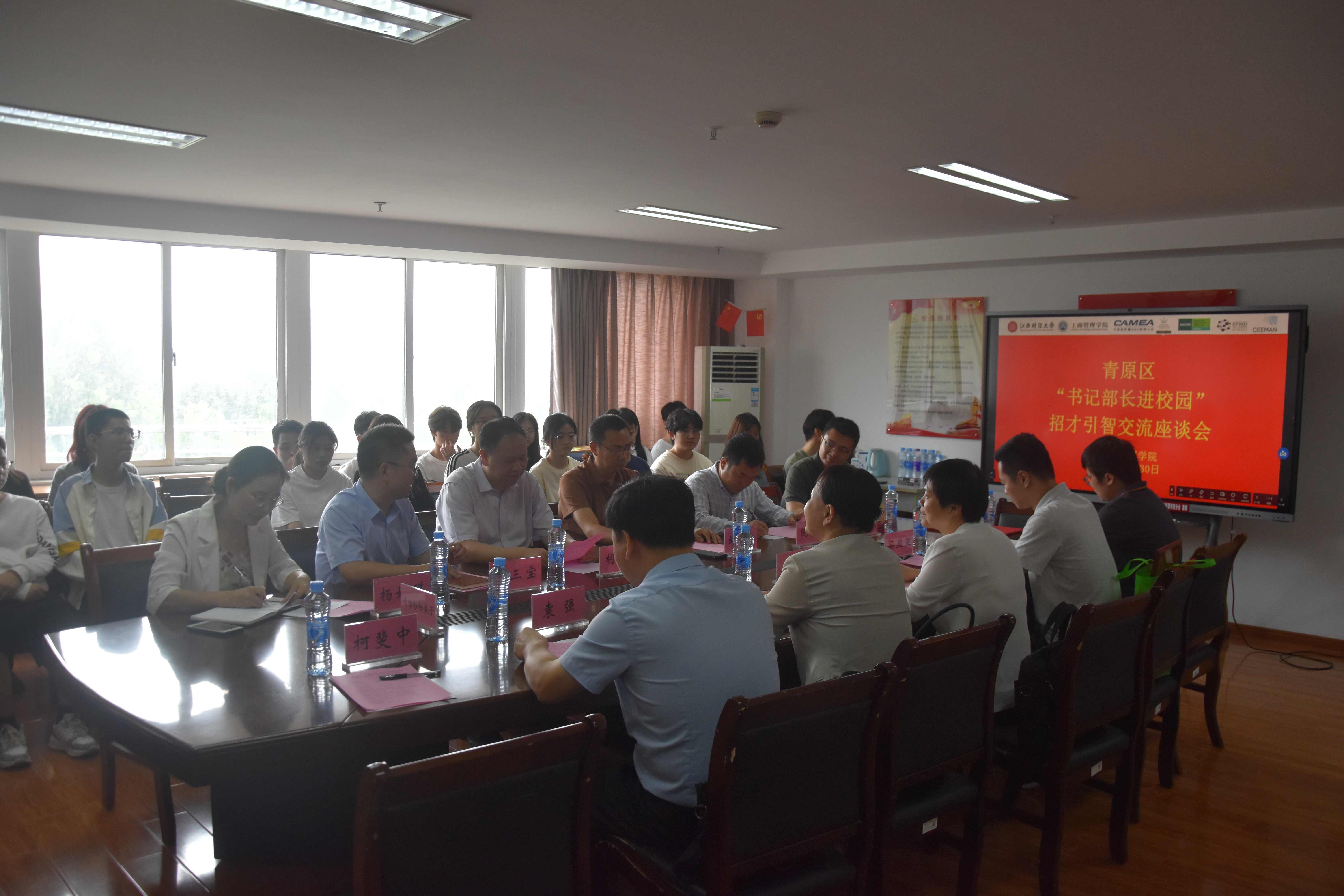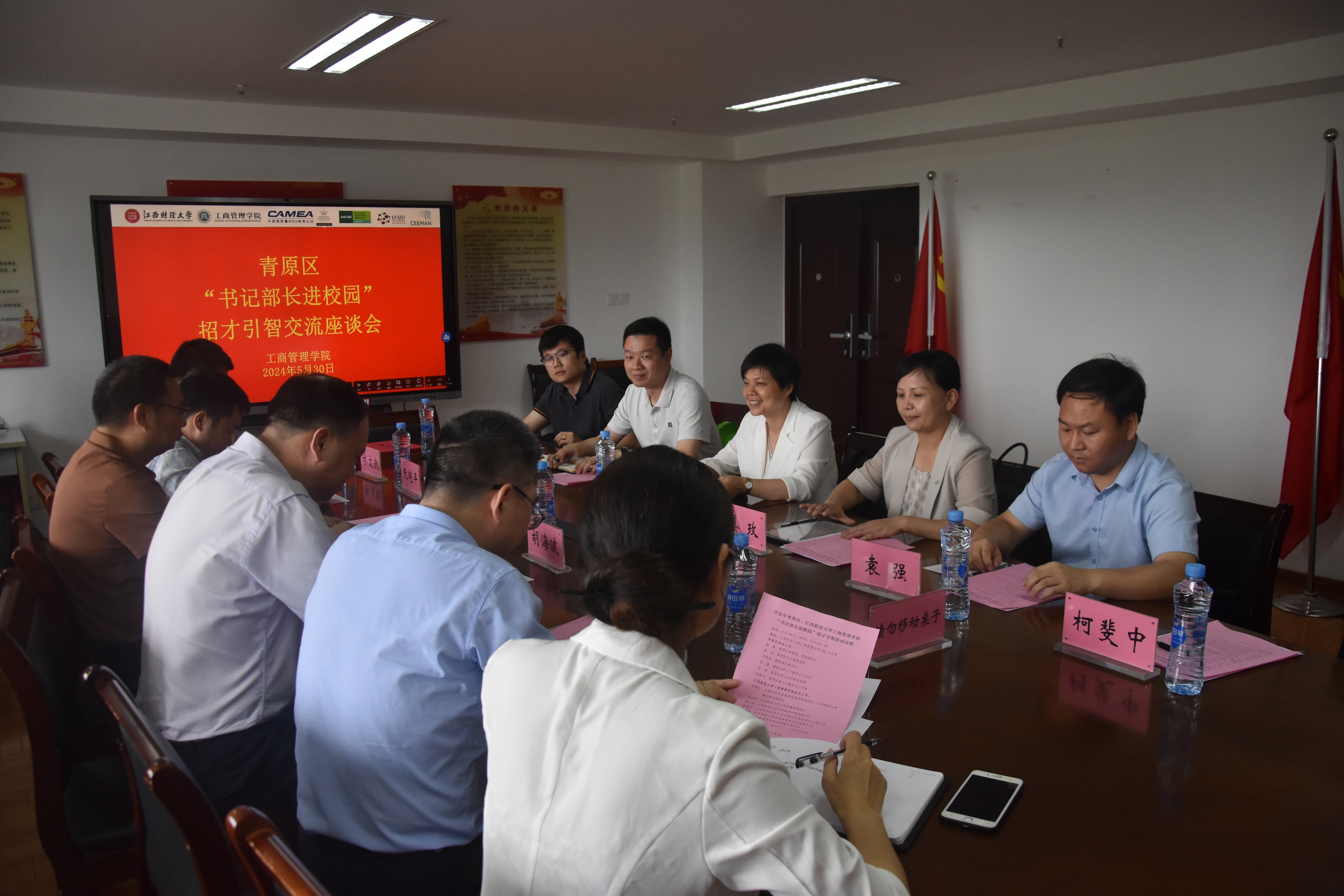 为提高学院毕业生就业率,助力地方经济发展,5月30日,青原区“书记部长进校园”招才引智活动座谈会在中至大楼503会议室举行。吉安市青原区委常委、组织部部长彭敏,区文广旅局局长蔡玫,团青原区委书记吴昊旻,青原区委人才服务中心主任袁强,青原区两山公司副总经理罗坤,青原区委人才服务中心干部柯斐中,工商管理学院院长胡海波、党委书记贺三宝,学校旅游发展研究院院长、赣州研究院院长邹勇文,校大学生职业发展促进中心副主任阮艳平,信息管理学院党委副书记杨婉琪,工商管理学院党委副书记周海燕、旅游管理系副主任林文凯以及江财青原籍学子、部分大三、大四学生代表等参加座谈会。