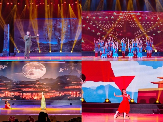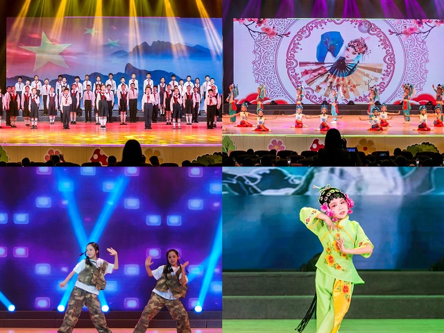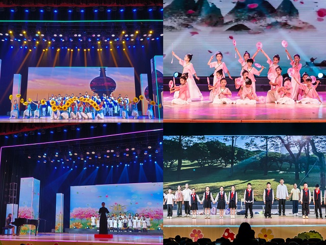 第四篇章为“同心向前共筑强国”。同舟共济扬帆起,我们同向同行。四(1)班的歌舞《新时代好少年》用歌曲和舞蹈的形式,传达了新时代青少年坚定信念、传承红色基因、争做文明好少年、担当民族复兴重任的决心和行动;心理情景剧《你并不是孤勇者》传达了关注心理健康、实现自我成长和传递希望与力量等核心信息和情感;校特色合唱班带来的合唱《萱草花》,学生用歌声传达了对母爱的深沉与伟大、对母爱的感恩与思念。