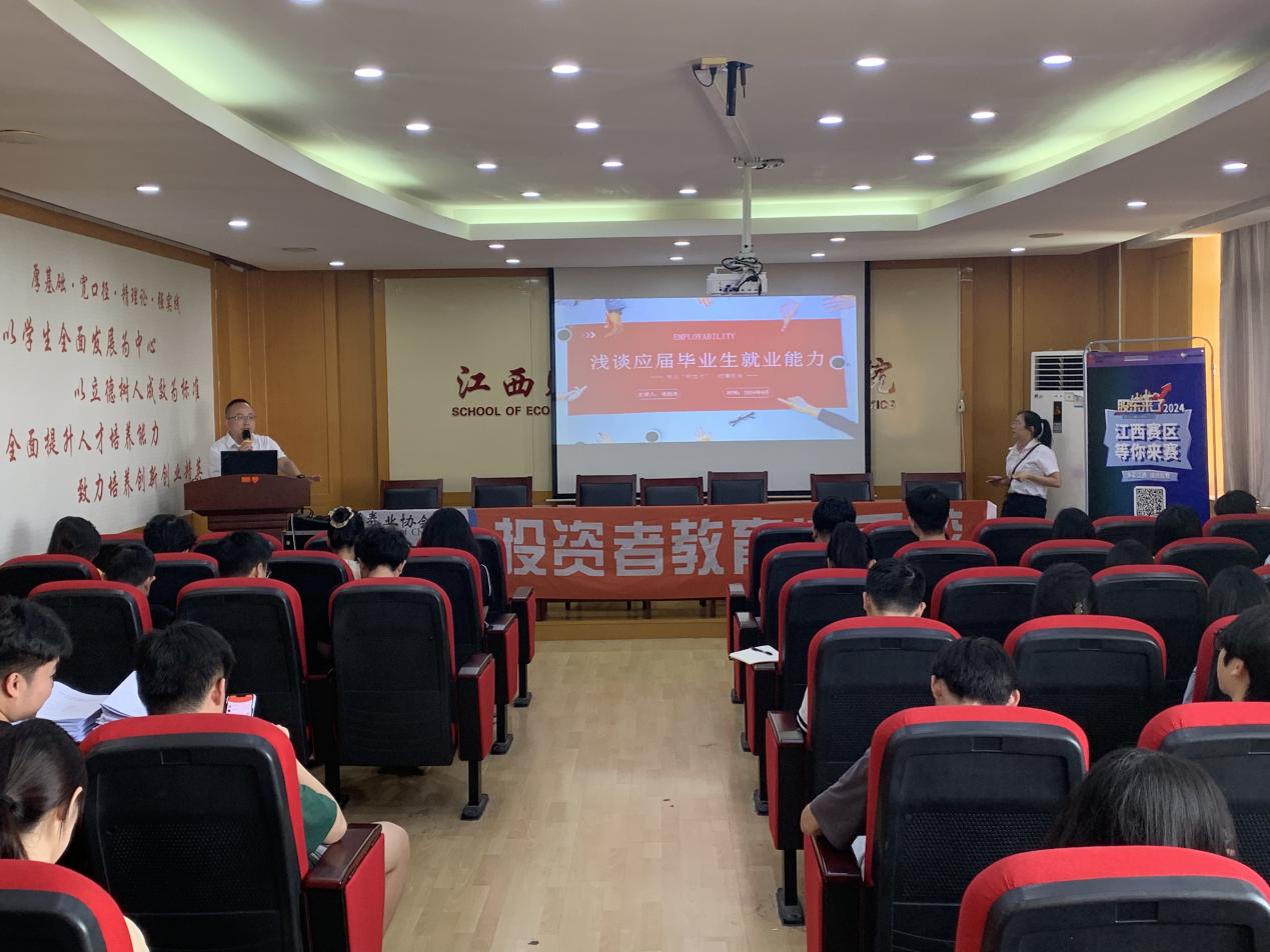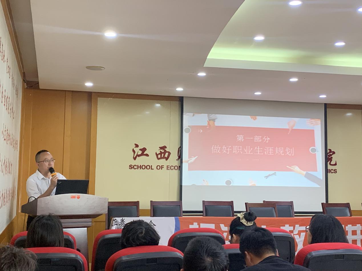 6月13日下午,经济学院举办企业高管聊生涯、话就业活动。学院邀请国新证券南昌绿茵路营业部负责人吴廷杰作为主讲人进行职业规划与就业指导。本次活动共有100余位在本、硕、博学生参加。讲座由就业专员钟义鹏老师主持。