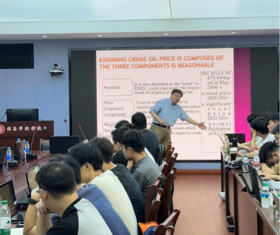 课堂上,汪寿阳教授从其指导的研究生应用EMD方法对国际原油价格进行特征提取,由此解决能源经济学两个难题的故事引入,向同学们介绍了经验模态分解、奇异谱等研究方法。此外,指导学生学习“数据分解+计量建模+深度学习”研究范式,鼓励大家积极思考,创新更多有效的方法来研究重大的经济社会管理问题。本次课程通过理论讲解和实验操作相结合,有助于我校学生掌握复杂数据建模分析及其应用最新理论和前沿发展,并对有效研究解决经济管理、社会管理和工程技术中的重要问题过程中如何开拓新思路有了更深入的启发和感悟。