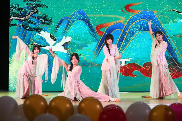 晚会节目精彩纷呈、高潮迭起,演员们用精湛的才艺为观众呈现了一场中外文化交流盛宴。热辣奔放的印度舞蹈《爱情故事》仿佛将观众领进了一个激情而神秘的国度;法语歌曲《Céline Dion -Parleràmonpère》的每个音符都在诉说着浪漫故事;中外学生合唱歌曲《月亮代表我的心》让人感受到无尽的温柔与浪漫;诗朗诵《念奴娇·赤壁怀古》中铿锵有力的字句如同历史长河中激荡的波涛,仿佛赤壁之上火光冲天的画面展现在观众眼前;唱跳舞曲《Dynamite》的悦耳歌声和动感舞姿让全场观众都律动起来,挥舞的荧光棒瞬间汇聚成了欢乐的海洋;江西服装学院的中国同学们倾情演绎的中国舞《隅双昭》展现了优美的传统舞姿,舞步温文婉转、身韵合一,仿佛每一刻都在诉说着千年的故事,使人沉醉其中;女声独唱《我的歌声里》旋律悠扬动人,轻轻触碰着听众的心灵;海外教育学院舞蹈社、音乐社呈现的现代舞表演《Sand》、合唱《Thisisme》将观众带入了一个充满创意与激情的艺术世界。
