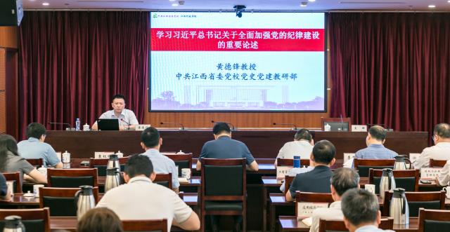 此次学习会分两个阶段进行。第一阶段邀请了江西省委党校黄德锋教授作《习近平总书记关于全面加强党的纪律建设的重要论述摘编》辅导报告。黄德锋教授从“纪律严明是党的光荣传统和独特优势”“习近平总书记关于全面加强党的纪律建设的重要论述的重要内容”“贯彻落实习近平总书记关于全面加强党的纪律建设的重要论述的实践要求”三个方面,系统全面讲解了《论述摘编》的主要内容和核心要义。各基层党委(党总支)书记,机关党委各支部书记参加了第一阶段学习。