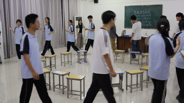 在殷微微老师的引导下,学生们按照规定的间隔逆时针移动,根据老师的语言提示进行了一系列生动的表演。学生们跟随老师的描述,通过各种肢体动作再现场景,每当完成一个动作,学生们都会忍不住笑出声来,整个教室充满了欢声笑语。在表演结束后,老师会邀请每个同学来谈一谈自己的感受和情绪。在体验不同情绪的同时,他们也学会了保持一定的理智,寻找合适的解决办法。
