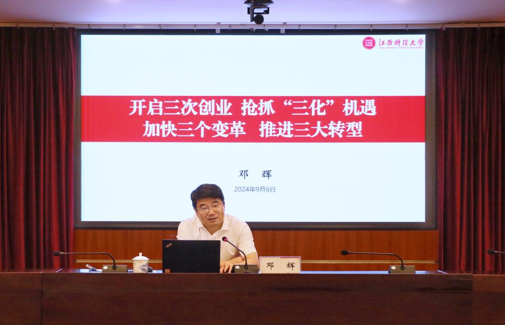 邓辉为2023年入职教师代表颁发《江西财经大学新入职教师课堂教学准入资格证书》,并以“开启三次创业 抓抢‘三化’机遇 加快三个变革 推进三大转型”为题作开班第一讲。他以“扎根江财,当好老师,做大先生”开篇,指出新入职教师要树立正确的职业观,认清教师职业的崇高性,认清教师肩负的时代使命,认清教师对学生的价值以及教师自身的责任。他强调,成为好老师应该是每一位教师的共同理想和追求,既精通专业知识、做好“经师”,又涵养德行、成为“人师”,努力做精于“传道授业解惑”的“经师”和“人师”的统一者。结合学校在教育事业高质量发展方面的机遇和挑战,邓辉寄望新入职教师传承江财人迎难而上,抢抓机遇的精神,主动服务学校高质量发展。做一粒种子,扎根江财,以强国之志办大学,以父母之心育新才。