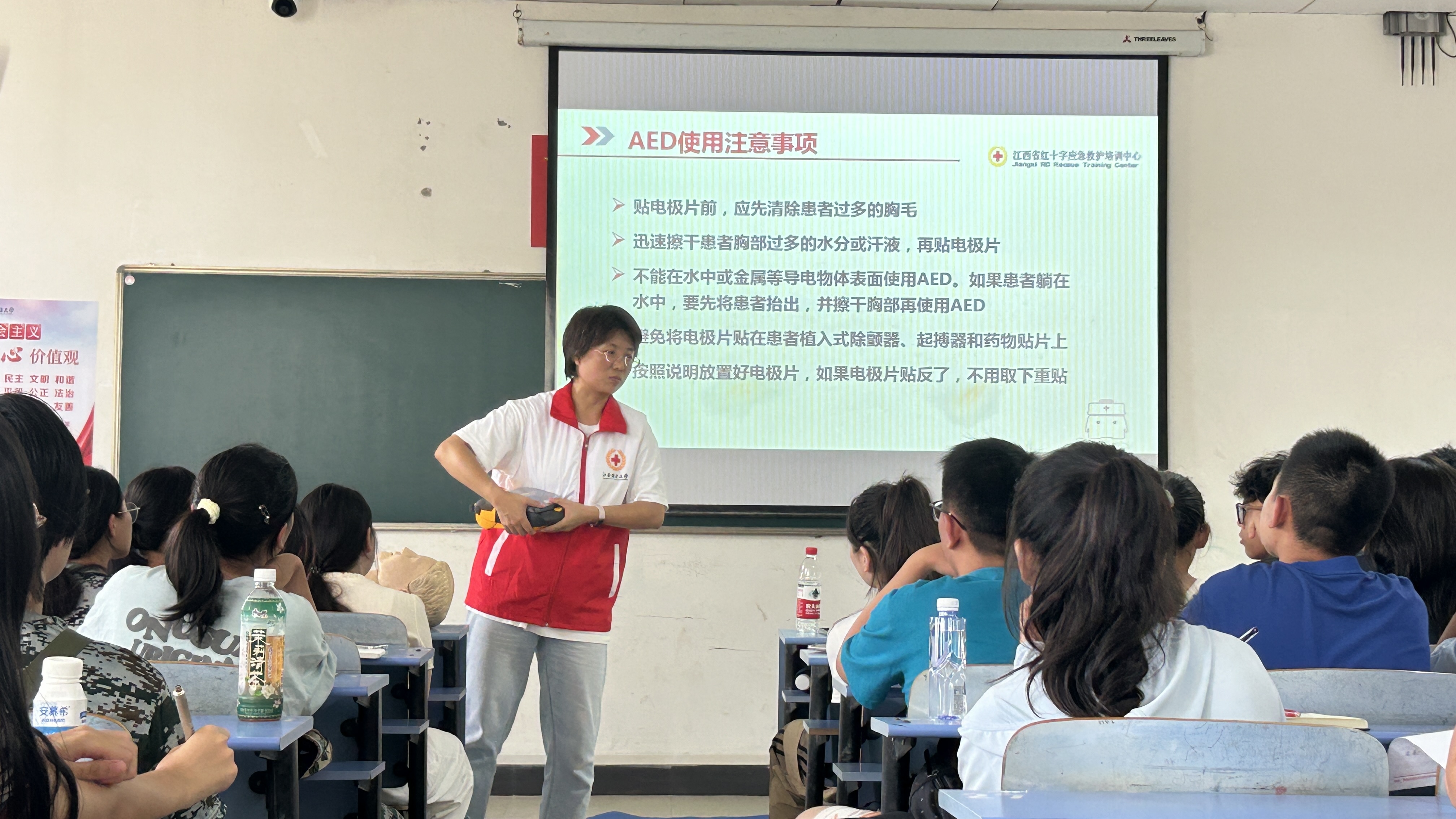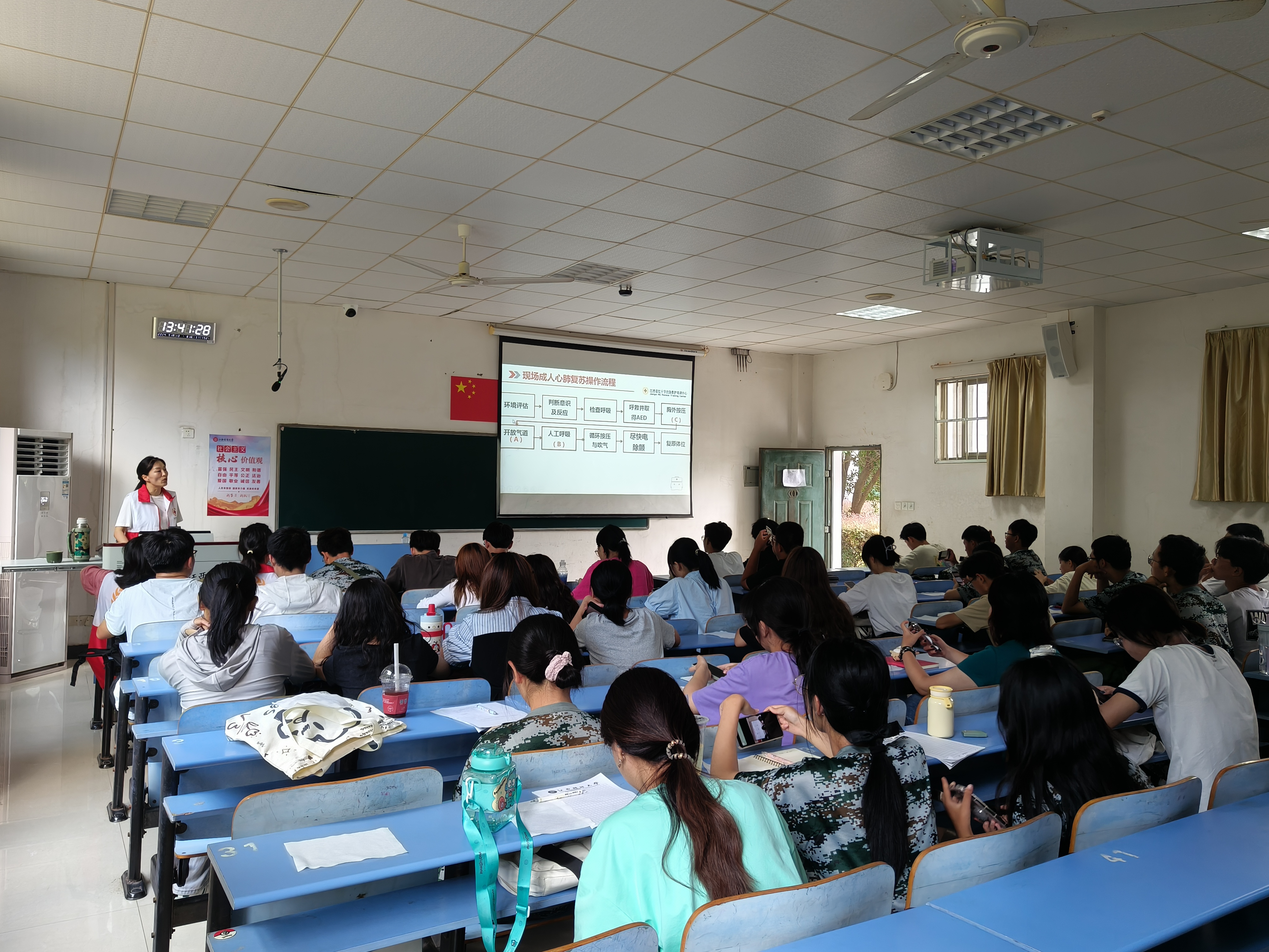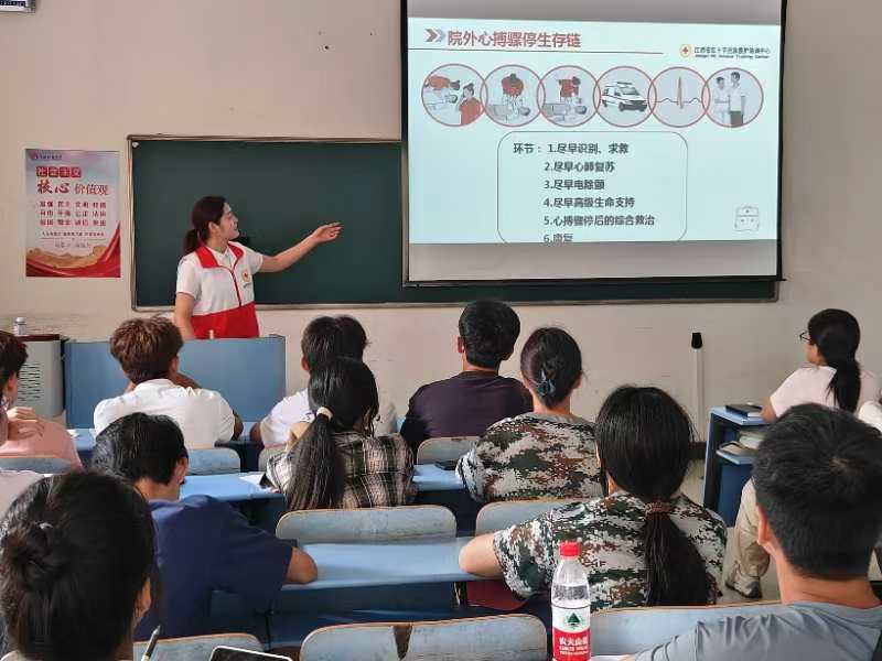 作为江西省红十字会应急救护培训进学校的系列活动之一,本次培训得到了江西省红十字会应急救护培训中心支持与指导。培训中,老师们详细介绍了学习和掌握心肺复苏操作的原因,心搏骤停的原理、心搏骤停后院内院外急救链条、徒手的成人心肺复苏操作要点以及自动体外除颤仪的操作要领,同时也向学生们传达了爱护生命,珍视健康、充分利用时间、规律作息等关爱生命的理念。