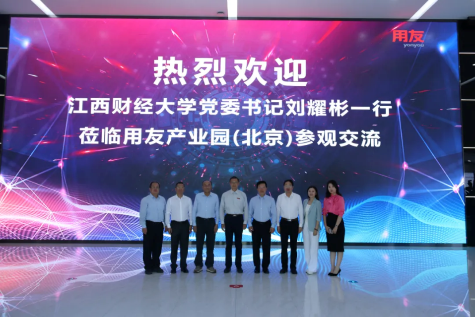 在京期间,刘耀彬带队走访北京校友企业,在北京用友产业园参观了用友数智企业体验馆。用友网络副总裁郝伟明全程陪同并介绍了用友在助力企业加速推进数智化方面取得的成绩,期待与学校共同推动产学研深度融合。