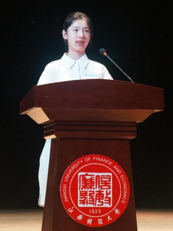 新生代表、2024级经济统计3班甘涵玉同学上台发言,她从“以‘信’为本,坚守信念”“以‘敏’为径,勤勉进取”“以‘廉’律己,清正自强”“以‘毅’前行,意志如刚”四个方面,表达努力成为“信敏廉毅”江财人的志气。