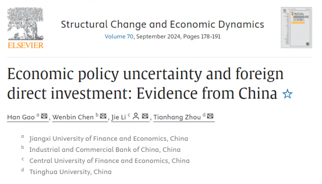 近日,金融学院高涵博士的研究成果在结构经济学领域权威期刊Structural Change and Economic Dynamics在线发表,论文题目为“Economic policy uncertainty and foreign direct investment: Evidence from China”。高涵为第一作者,江西财经大学金融学院为第一署名单位,论文合作者为中国工商银行陈文彬、中央财经大学李杰副教授、清华大学周天杭博士。