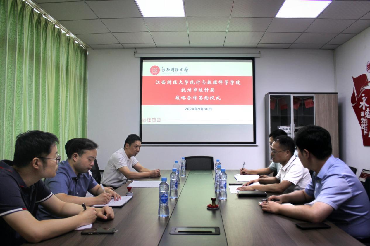 9月30日上午,抚州市统计局赴江西财经大学统计与数据科学学院与我院举行战略合作签约仪式。统计与数据科学学院党委书记陶春海、首席教授罗良清、党委副书记刘贺、抚州市统计局党组书记、局长郑海文和党组成员、副局长刘志华出席签约仪式。
