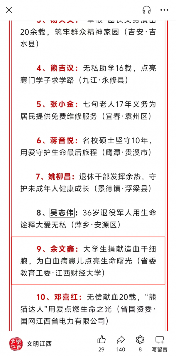 近日,江西省文明办向社会发布2024年第三季度“江西好人榜”,我校余文鑫同学上榜“助人为乐”类别。