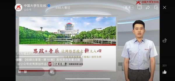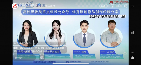 10月15日,学校党委宣传部教师赵旻应邀在高校思政类公众号重点建设项目组、中国大学生在线举办的“校媒云享荟”第十期中作优秀原创作品创作经验分享。分享在中国大学生在线官方视频号、微博、B站,高校思政网官方视频号同步直播,不仅展示了江西财经大学在创新网络思政育人工作方面的积极探索和显著成效,也为其他高校提供了有益的借鉴和启示。