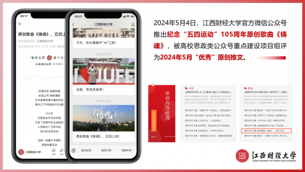为纪念“五四运动”105周年,江西财经大学官方微信号于2024年5月4日发布歌曲《铸魂》视频,作品被高校思政类公众号重点建设项目组评为2024年5月“优秀”原创推文。歌曲《铸魂》把握青年群体的特点和习惯,采用对年轻人具有吸引力和影响力的说唱歌曲形式,整体音乐节奏感鲜明,通过多变的节奏和流畅的旋律,让歌曲既具有时代感和力量感。赵旻围绕“思政+音乐”的主题,以原创思政歌曲《铸魂》创作为例,从主题定位、音乐风格、歌词构思、剪辑素材、歌曲录制五个部分详细分享了背后的创作过程,介绍了江西财经大学微信公众号积极探索创新,将思政教育融入音乐创作中,陆续推出《崛起》《“赣”出未来》《百载》等30余首原创或改编的思政歌曲,让网络思政走“新”又入“心”。2024年8月,赵旻还曾应邀在中国青年报举办的“青春为中国式现代化挺膺担当”全国提升高校融媒体育人实践研讨会上以《“五度”并举,江财网络育人心方式》作经验分享。