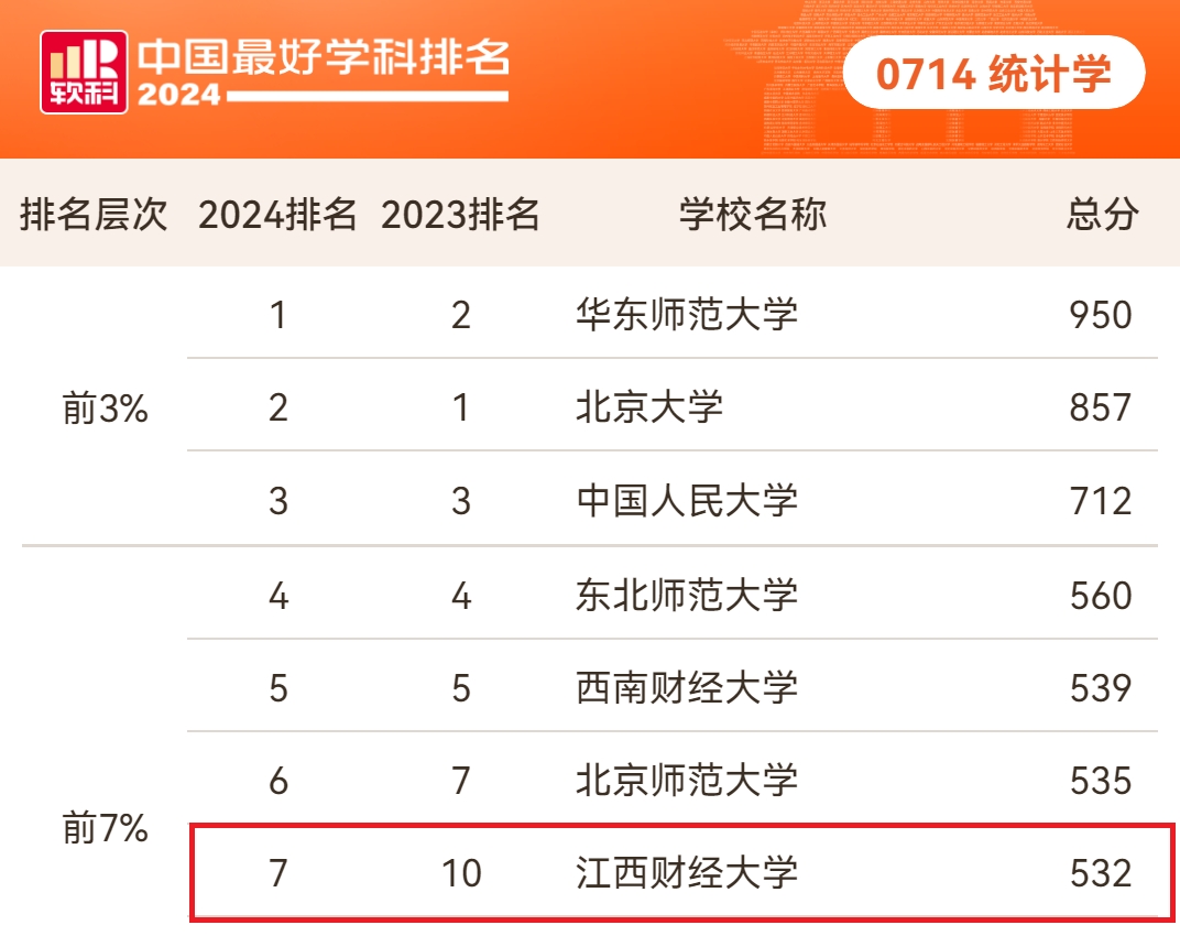 近日,2024软科中国最好学科排名发布,我校统计学学科进入排名前7%,位列全国第7位,较去年上升3位。