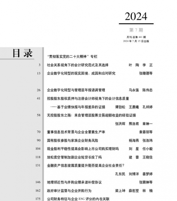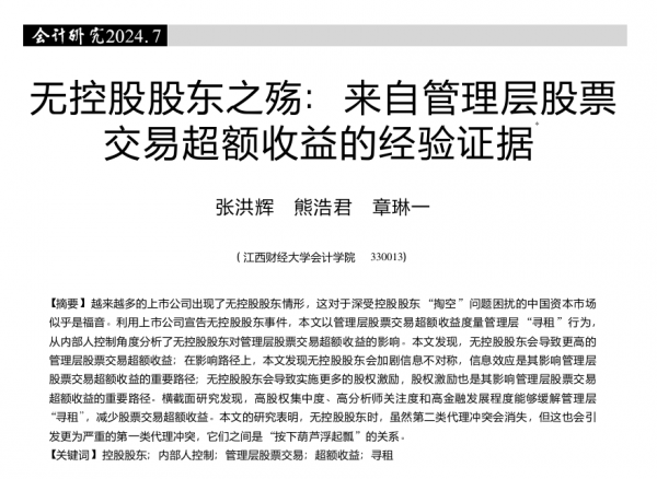 近日,会计学院张洪辉教授与2021级硕士生熊浩君、会计学院章琳一副教授合作完成的论文《无控股股东之殇:来自管理层股票交易超额收益的经验证据》发表于国内权威A-期刊《会计研究》2024年第7期。