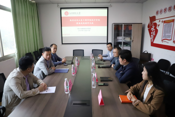 10月25日上午,山东工商学院统计学院一行来统计与数据科学学院就党建和学生等工作开展调研座谈。山东工商学院统计学院党委书记宋主修、党委副书记魏振波、副教授刘永久,统计与数据科学学院党委书记陶春海、院党委副书记刘贺、学工办副主任钟晴和辅导员龚文林出席会议。