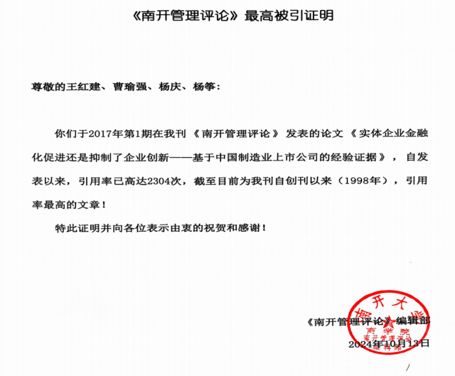 我校财经数据科学重点实验室、金融学院王红建老师发表于《南开管理评论》的文章《实体企业金融化促进还是抑制了企业创新——基于中国制造业上市公司的经验研究》,引用率高达2304,成为创刊以来最高被引文章。