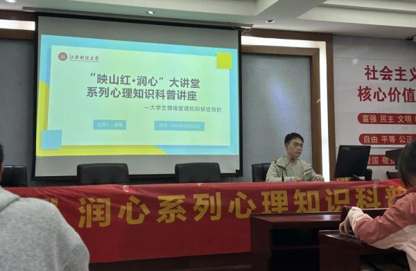 11月20日下午,财税与公共管理学院开展“映山红·润心”系列讲座——阳光心态:大学生情绪管理与抑郁症预防,由心理辅导员李楠主讲。
