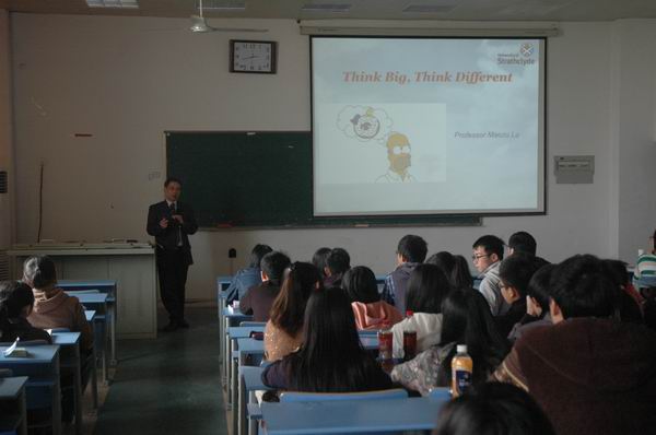陆懋祖教授首先用“为什么中国古代白天不打更”的问题引发思考,在听众积极讨论之后,他分析了中西思维模式的不同,启示大家在平常的学习生活中,学会拆掉思维的墙,多问一些为什么。接着,陆教授继续剖析中西方的思维、文化、历史以及哲学思想的差异,激发同学们的思考。他告诉同学们,要学经济类学科,“Think big, Think different”是关键,创新来自我们独立的思考。