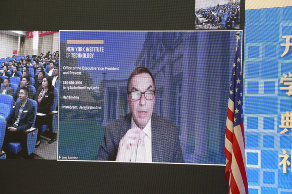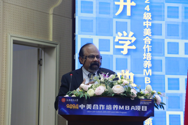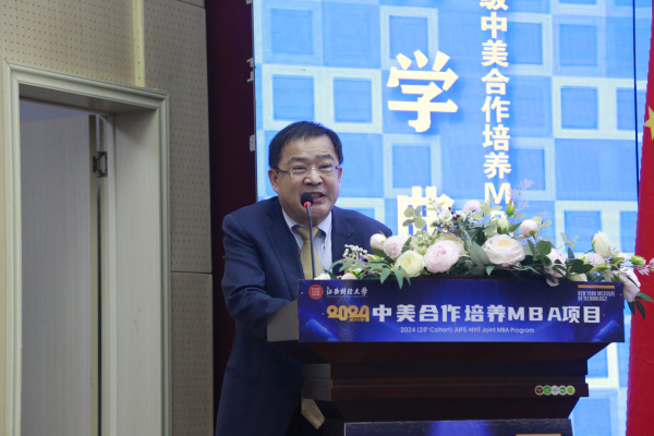 杰瑞·巴伦丁向新生们表示祝贺,他回顾了美国纽约理工学院和江西财经大学合作举办MBA项目26年的发展历史,并对江西财经大学的持续支持以及相关领导老师的辛勤付出表示感谢。他强调,这一合作项目对培养学生成为具有全球视野的商业精英的重要价值,并鼓励新生们要学会以批判性的思维看待问题,同时结合创造性思维去解决问题,努力将所学的观点、知识和技能在全球化背景下加以应用,用自己的智慧和善良解决问题,造福全人类。