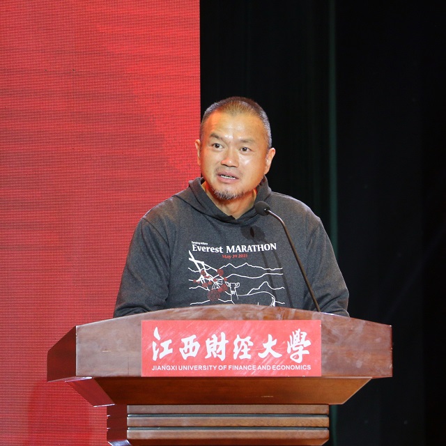 广东校友会副会长邓超代表设奖校友和企业发言,他向全体受表彰的江财学子表示诚挚祝贺,分享了自己作为江财校友的感悟。他认为人生要做好三件事:选择、选择以后的坚持、坚持之后的感恩。从自己走进江财到选择奔跑,再到“因爱奔跑”的亲身经历,告诉每位学生梦想无极限,所有成人达己的梦想都始于卑微的努力和坚持,人生的赛道没有单行道,也没有人会是一座孤岛,有爱就一定会有希望!
