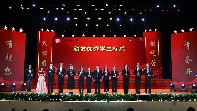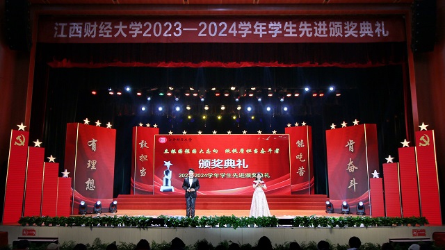 大学生艺术团在本次学生先进颁奖典礼上演唱了歌曲《光荣与梦想》,表演了舞蹈《觉醒》,整个颁奖典礼现场秩序井然、气氛热烈,展现了江财师生昂扬向上、团结进取的良好精神风貌,2023-2024学年学生先进颁奖典礼在振奋人心的江财校歌声中圆满落幕。(文/学工部(处) 吴茜 图/刘建芳 审核/姜莹 赵旻 李大晖)
