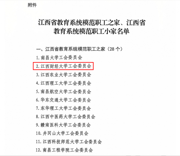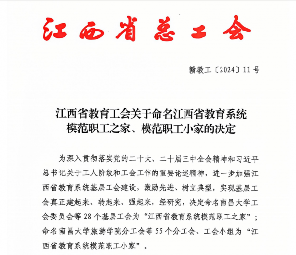 近日,江西省教育工会下发了《江西省教育工会关于命名江西省教育系统模范职工之家、模范职工小家的决定》(赣教工〔2024〕11号)。江西财经大学工会委员会获评“江西省教育系统模范职工之家”,工商管理学院分工会获评“江西省教育系统模范职工小家”。