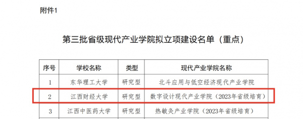 近日,经全省普通本科高校的积极申报,由省教育厅携手省发展改革委、省工业和信息化厅共同组织的专家评审团,经过严谨细致的评审流程,并经由委厅专题会议研究,决定江西财经大学数字设计现代产业学院入选第三批省级重点现代产业学院立项建设单位。