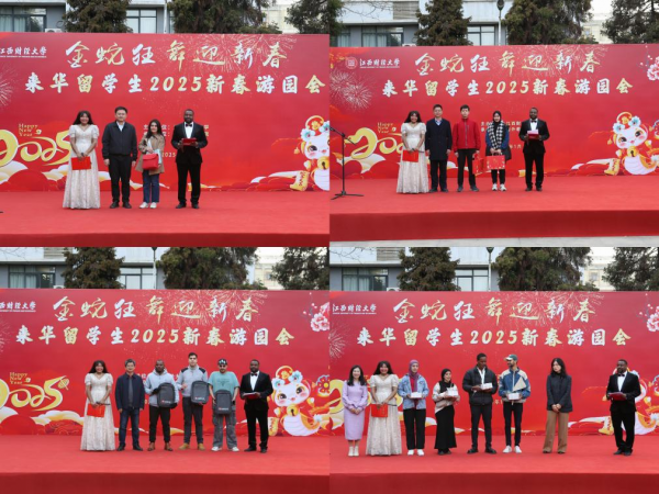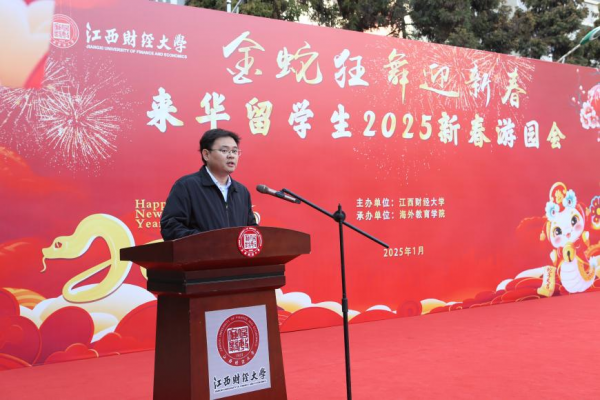 1月20日,蛟桥园北区留学生公寓西侧广场洋溢着喜庆祥和的节日氛围,“金蛇狂舞迎新春”2025年来华留学生新春游园会在此成功举办。副校长方玉明出席活动并致辞,南昌市公安局出入境管理支队与经开分局出入境大队代表、海外教育学院负责人、保卫处代表、留学生班主任与400余名来华留学生齐聚一堂,共庆新春佳节。