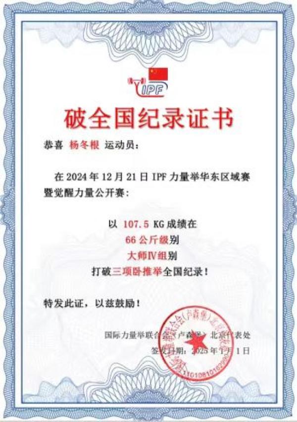 据悉,2020年,杨冬根在南昌第一次参加WP全国力量举比赛,便打破了卧推102公斤大师组全国纪录。往后他不断超越自我,他2023年先后参加了IPF力量举华北区域北京赛66公斤赛、IPL武汉第一届力量举公开赛卧推100公斤赛、CPA上海力量举公开赛,获得多项冠军并创下多项全国纪录。