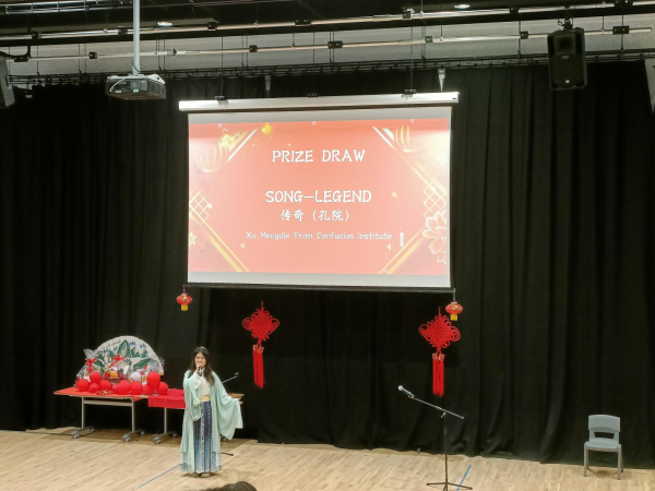 庆祝活动的文艺演出同样精彩纷呈,高潮迭起。考大孔院留学生志愿者徐梦蝶深情献唱中国经典歌曲《传奇》,歌声悠扬,余音绕梁,为新春增添了一抹温馨的色彩。