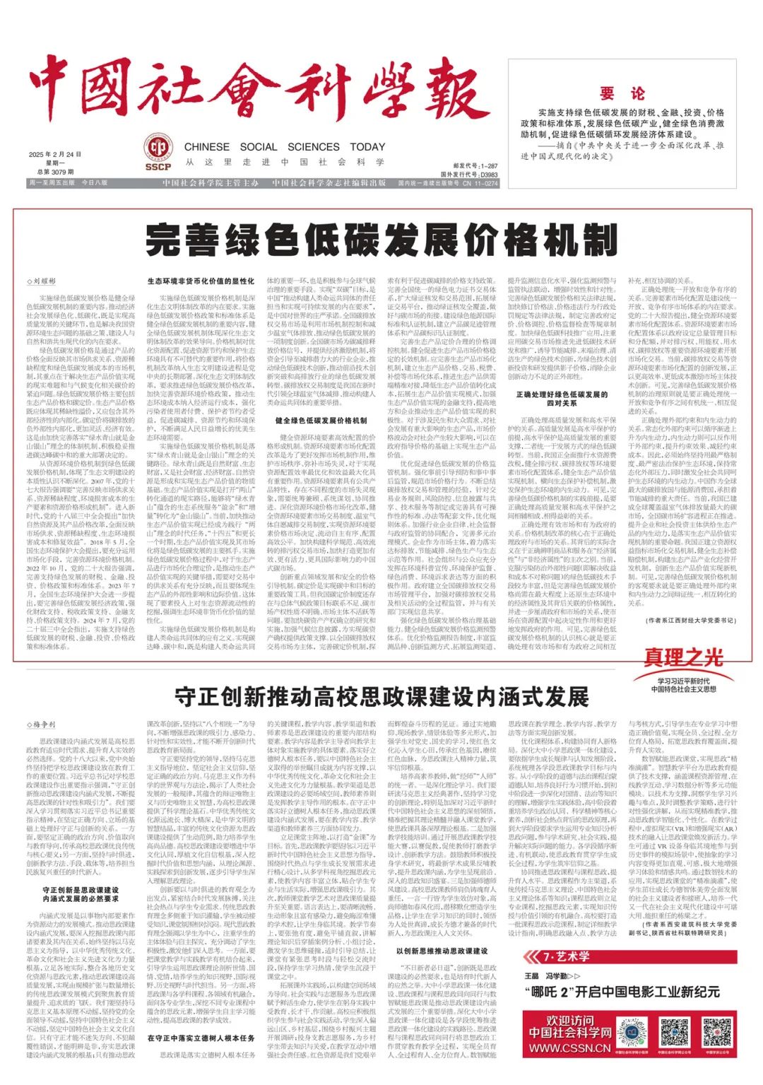 2月24日,《中国社会科学报》头版头条刊登校党委书记刘耀彬理论文章《完善绿色低碳发展价格机制》。
