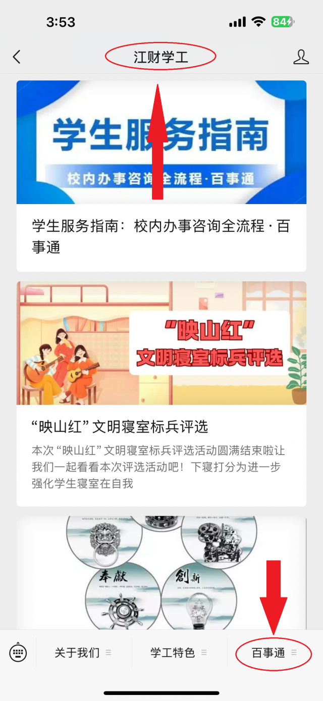 第一步,智能辅导员“学工百事通”答疑号,关注“江财学工”微信公众号,右下角“百事通”进入,或进入江西财经大学党委学生工作部官网,首页浮窗点击进入,也可直接点击链接:https://work.weixin.qq.com/kfid/kfcc7fb50a44997bfa1,跳转进入微信客服问答窗口咨询。