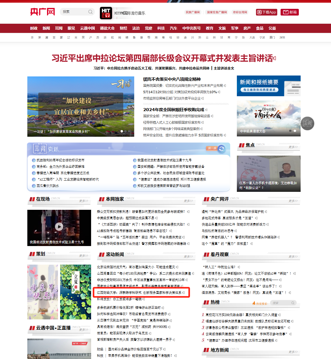 近日,央广网首页新闻以“江西财经大学:深耕跨学科研究创新服务国家科学决策体系”为题详细报道了学校聚焦国家发展成就与经济实力评估中的关键问题,成立国势研究院。旨在通过基础数据融合大语言模型技术分析国家实力的多个方面,以扎实的理论成果支撑国际传播中的“中国经验”。