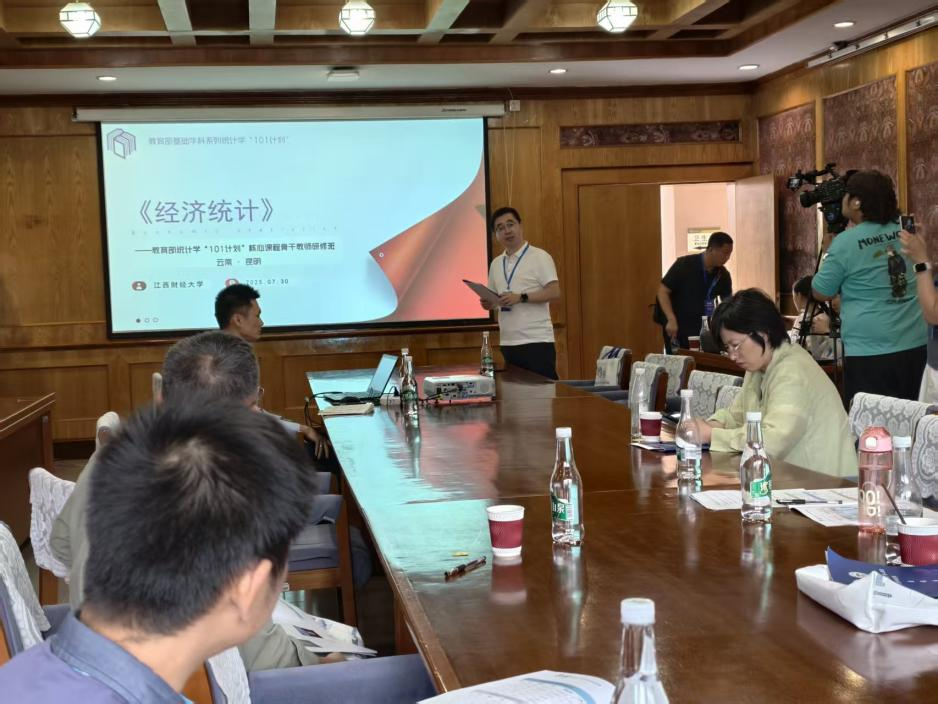 冯凌秉代表我校教育部统计学101计划《经济统计》教材撰写组进行了一个半小时的授课。他紧密结合我校在经济统计、国势研究等领域的特色优势,系统介绍了《经济统计》教材和课程的整体构建思路、核心章节内容、教学重难点以及特色亮点设计,并展示了部分章节内容。整体授课内容详实,获得了与会专家与教师的高度评价与认可。(图文/统计与数据科学学院 编辑/范志宇 审核/一审 姜莹 二审 赵旻 终审 成亚林)