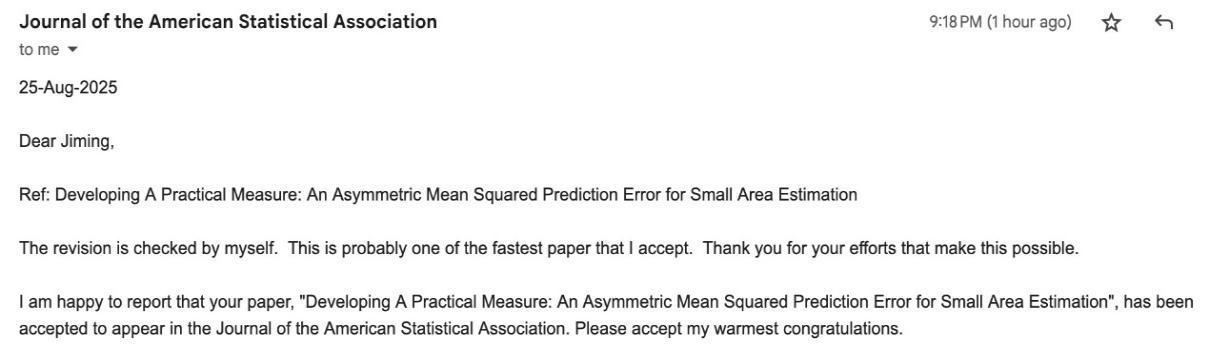 近日,统计与数据科学学院马海强副教授与俄勒冈健康与科学大学Thuan Nguyen副教授及加州大学戴维斯分校蒋继明教授合作完成的论文《Developing A Practical Measure: An Asymmetric Mean Squared Prediction Error for Small Area Estimation》被统计学国际顶尖学术期刊《Journal of the American Statistical Association》(简称JASA)正式接收,马海强副教授为论文第一作者,我校为第一单位。