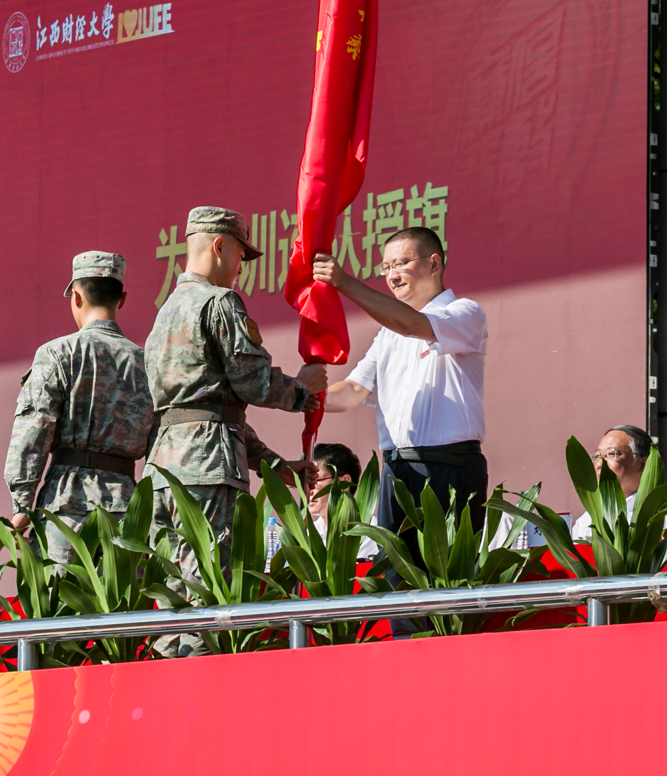 刘耀彬为军训连队授旗,主席台下热烈的掌声此起彼伏。