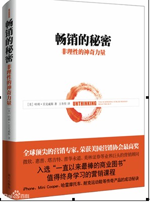 推荐词:在盲测中,2/3的人更喜欢百事可乐,但购买时他们却选择了可口可乐——我们在选择产品或服务时,往往并不理性。这种非理性背后的秘密因素是什么?在作者看来,童心、文化、视觉是最主要的三大因素。人类的最爱就是故事,所以他选择用“讲故事”的方式来写作本书:从苹果电脑的诞生到性感女神的陨落,从音乐中的谜团和韵律到日本任天堂Wii游戏的崛起,从维他命水的包装到畅销书和热门电影的名字长度,书中讲述了很多让人深感惊奇的故事。从中我们就能发现,那些深谙消费者心理的人和企业,是如何创造畅销神话、商业传奇的。 责任者:(美)哈利·贝克威斯著 王冬佳译出版发行项:南方出版社,2013馆藏地:蛟桥园图书馆,麦庐园图书馆索书号: F713.3/1481  资料来源:豆瓣网、亚马逊网、超星数字图书馆