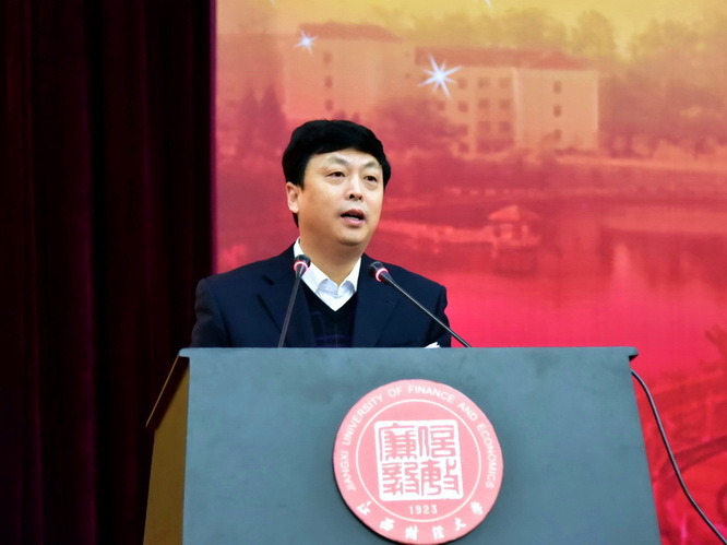 校长王乔在讲话时首先代表学校向毕业生们的亲人和老师表达了深深的敬意和诚挚的感谢。他意味深长地告诫毕业生们毕业证和学位证并不能代表成功,迈向卓越的道路需要“学术精神和品格”这样的“精神内核”。首先,“卓越之路不仅要心存梦想,更需要有学术精神之纯粹朴实,勇往而精进”;其次,“卓越之路不仅需要责任与担当,更需要学术精神之精研专攻,奋斗而不懈”;他希望每个毕业生能够把“大学所赋予的学术精神和追求卓越的意识”带走,把“信敏廉毅”和“敬业乐群、臻于至善”的江财精神牢记于心。最后,校长用五个“万岁”结束了自己的讲话“毕业万岁,青春万岁,梦想万岁,友谊万岁,江财万岁!”