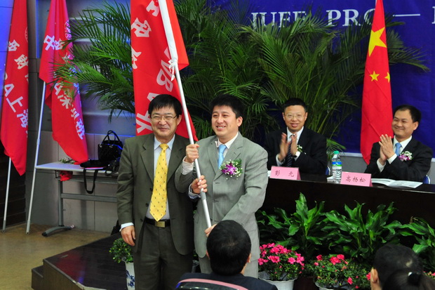 在开学典礼上,刘贤方教授还为中美MBA北京班、上海班和深圳班三个班级授旗。典礼结束后,全体领导和学员在蛟湖边合影留念。