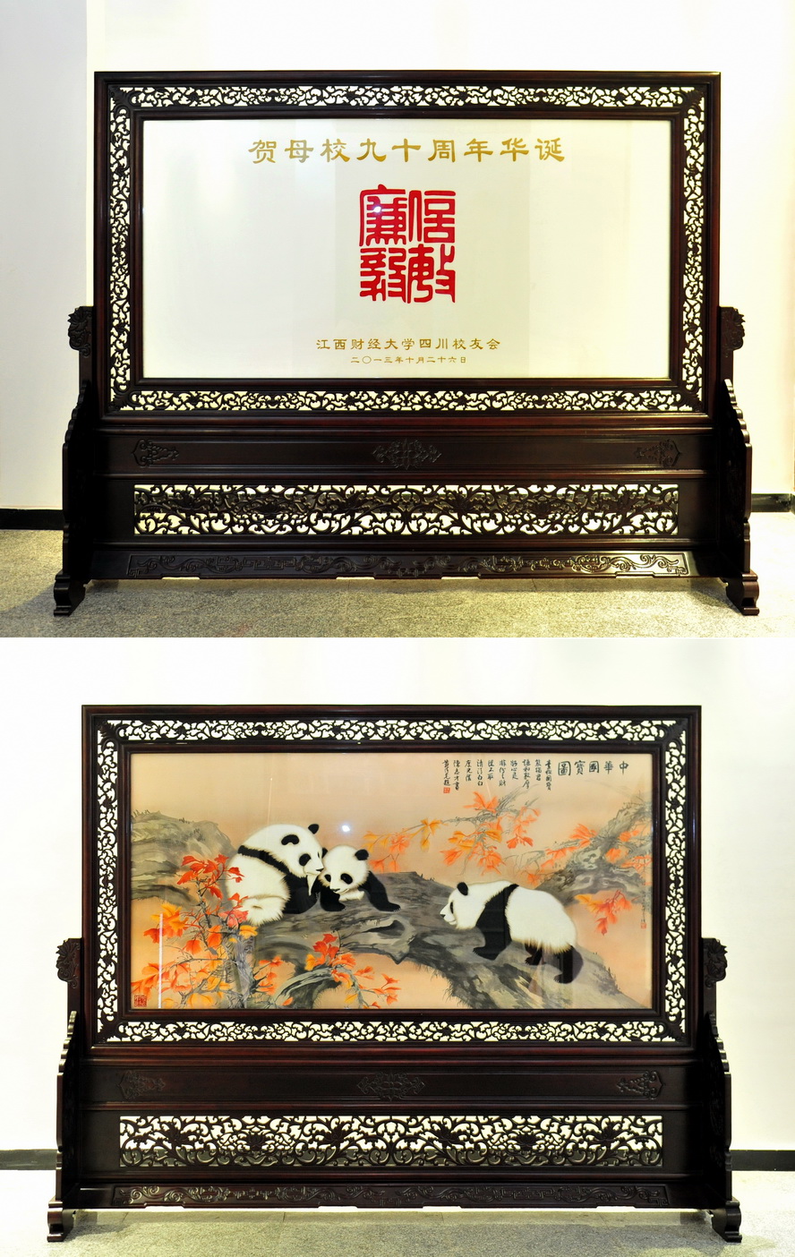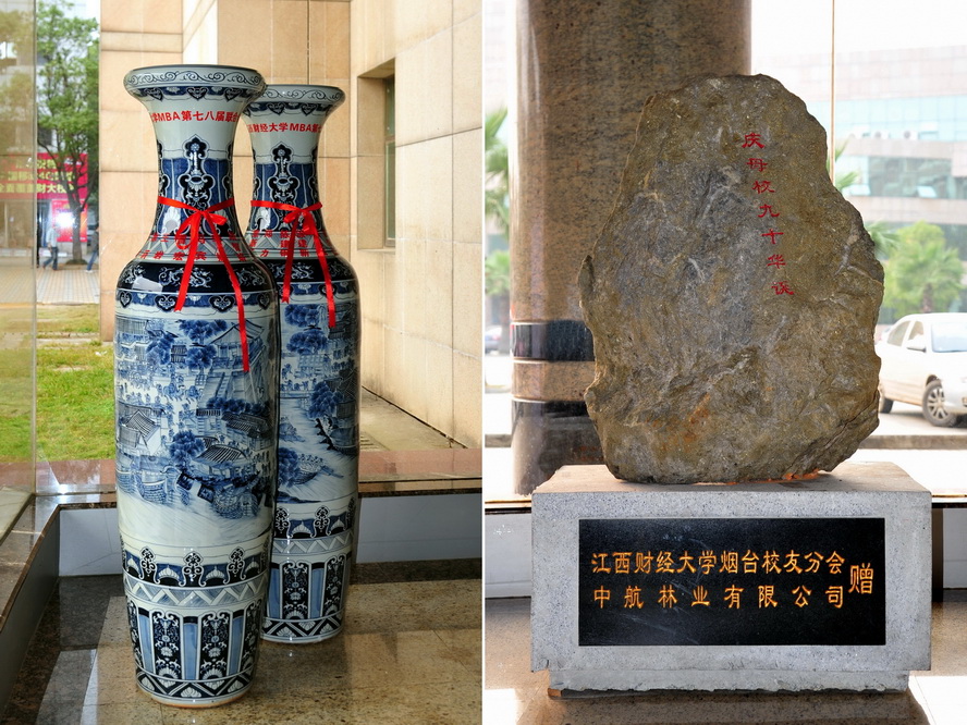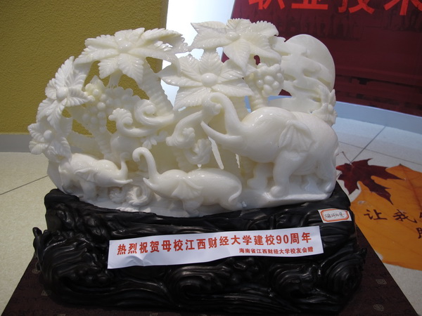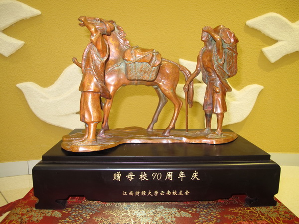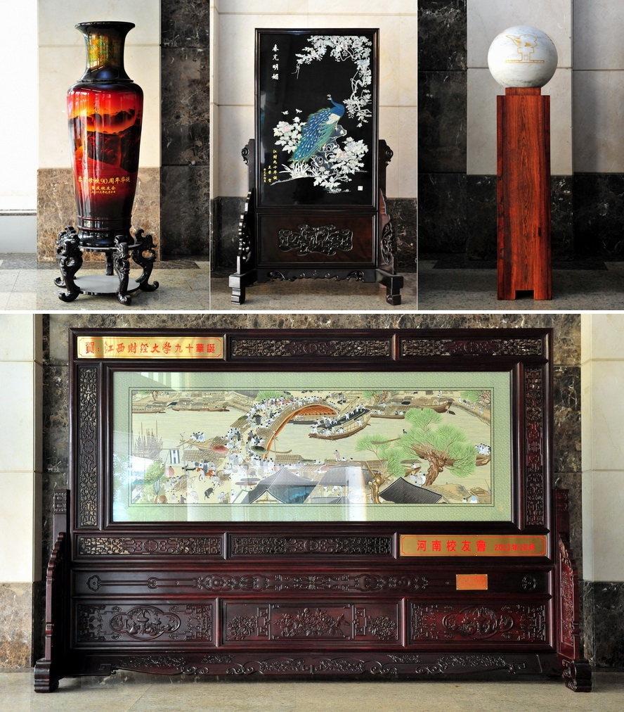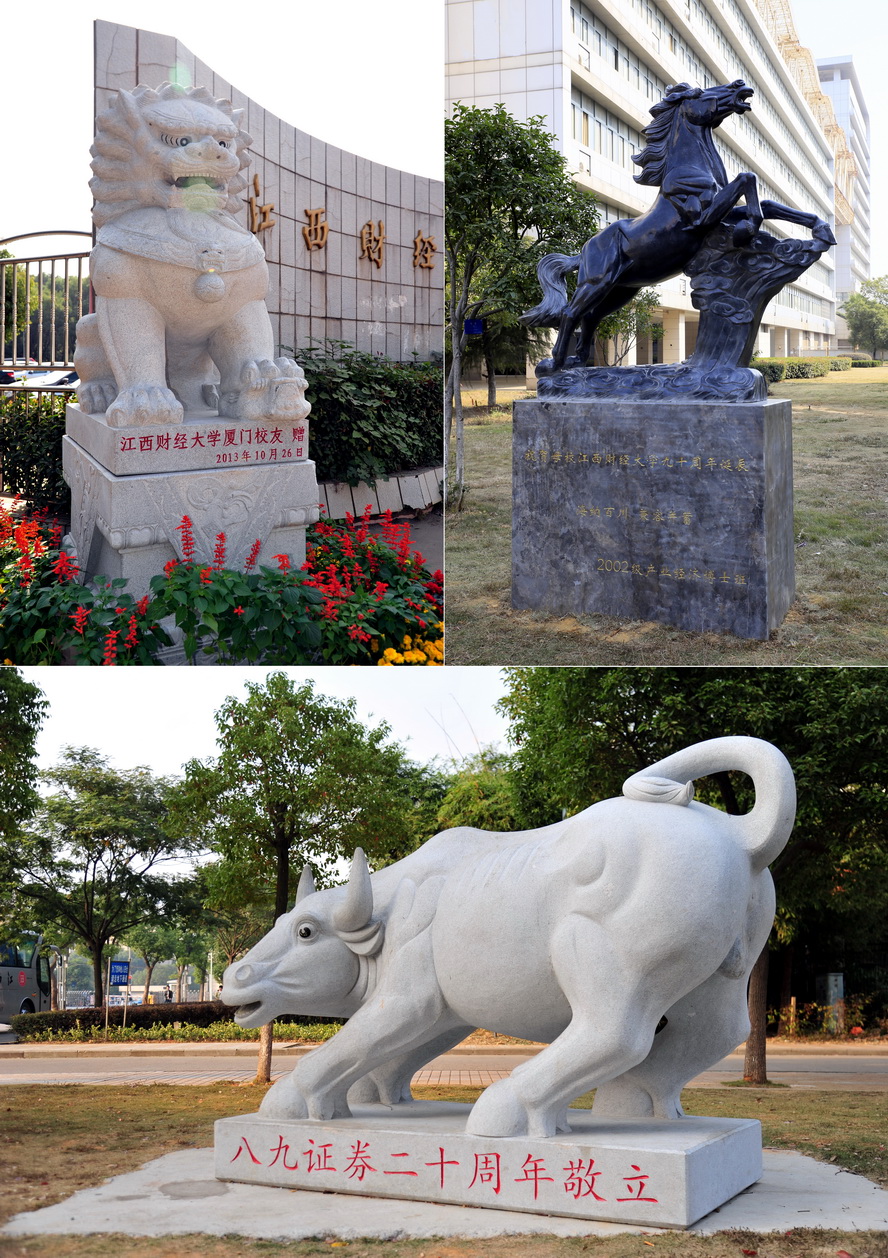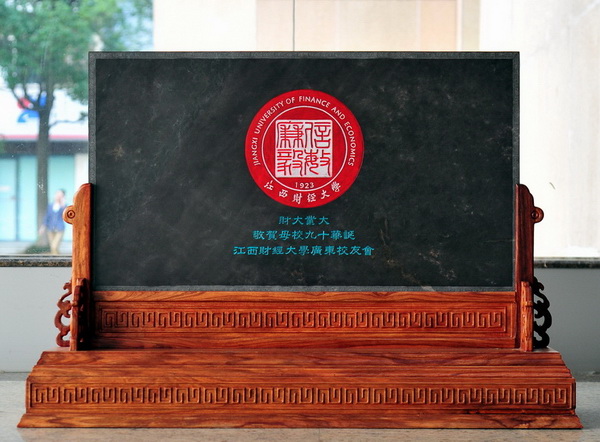 细心的人们可能会发现,最近江财校园内增添了不少新景观:蛟桥园西门前《石狮》生威,南区草坪上《飞马》腾空,《华尔街牛》气冲天,《龙凤呈祥》壁立南浦;校友馆内,海南《贝雕》、《珠海渔女》,《茶马古道》,满目《中华国宝图》,绘就《春色满神州》;《五羊砚屏》、《金石》生辉,《吉庆铜鼓》、《汉白玉球》,把国际学术交流中心报告厅装点得《春光明媚》,令人目不暇接;“江水北流穿赣省,财源滚滚向前行,长相忆里生梦幻,青史师恩万年情。”岳学鲲校友乘兴挥毫献辞,翰墨飘香江财园……