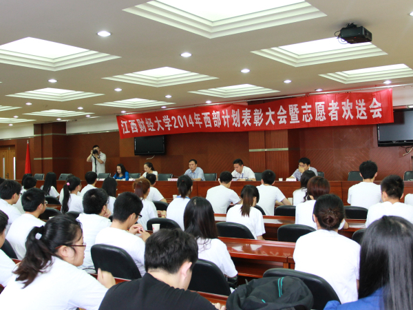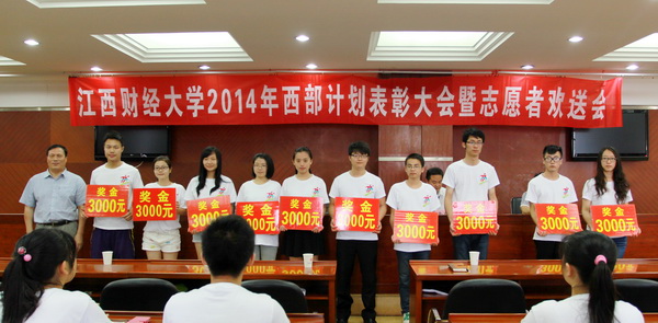 王金华为志愿者们颁发了3000元的奖金。习金文宣读了《关于表彰2014年大学生志愿服务西部计划志愿者的决定》,授予了50名同学“优秀青年 志愿者”荣誉称号。志愿者蔡佳代表发言感谢母校的培养,并承诺定将以专业所长服务当地建设,不辜负学校和老师们的期望,将江财人的优良传统带到志愿 服务工作中去。