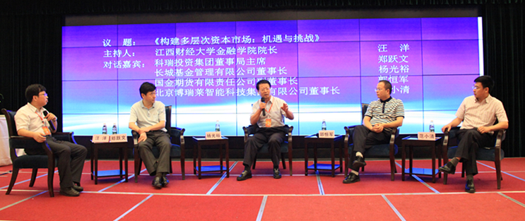 在圆桌对话阶段,汪洋、郑跃文、杨光裕、新业证券有限公司董事长兰荣、国金期货有限责任公司副董事长、原江财教师郭恒军、北京博瑞来智科技集团董事长范小清校友和四川省社科院金融研究所罗志华校友、北京中视东升文化传媒集团总裁高素梅校友、江西财购集团董事长陈建钢校友、成都农商银行财务副总监宁永忠校友、建设银行广西南宁高新支行行长黄瑞洪校友等也分别就“建构多层次资本市场:机遇与挑战”和“融资难与融资贵的现状”两个话题发表了自己的看法。