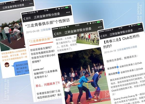 金融学院团委积极适应移动互联网时代思政教育的新要求,以微博、微信平台为载体,形成与学生线上线下的互动模式,推出了“三走微专栏”、“班级运动风采微评比”、“青春俱乐部”线上预约等一系列青年学生愿看、想看、主动看的“三走微项目”,成为进一步推进“三走”活动的有力抓手和重要补充。
