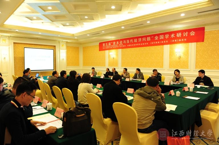在学术交流活动中,上海财经大学冯金华教授认为商品价值有形成价值与实现价值两种含义,实现价值是所有单位商品形成价值的线性组合或加权平均,商品的形成价值与实现价值往往不相等,从而提出了价值在行业间转移的概念和条件。江西财经大学罗雄飞教授剖析了马克思独特思维方法的形成过程、基本特征,并认为马克思的思维方法超越了黑格尔哲学、康德哲学、实验科学。清华大学孟捷教授做了劳动力价值再定义与剩余价值论的重构的报告,提出了马克思剩余价值论的十条相关假设,剖析了劳动力价值的含义,认为劳动力无内在价值,因劳动力商品的出让实际上是出租劳动力的使用权,所以可以把工资理解为一种特殊的租金,故工资是在最低工资水平标准基础之上由劳资双方竞争决定的。最后重新构建了剩余价值率的计算公式,从这个公式出发可以推导出不变的剩余价值未必对工人有利、增加的剩余价值也未必对工人不利的结论。山东财经大学董长瑞教授对腐败问题进行了政治经济学分析,认为生产资料私有制为腐败提供了制度基础。他认为一个社会的稳定结构应是椎体型而非金字塔型和橄榄型,所以应以公有制为基础保证椎体的基础(即下方的柱形部分),以劳动差异化作为收入分配差异化的基础,公有制是根除腐败的制度基础。山东财经大学崔宝敏博士就我国农地产权制度的多元主体和性质做了交流。江西财经大学张任由、汪阳、张凯三位研究生在导师的指导下在会上交流了研究论文。学术交流结束后,孟捷教授做了评论与总结,他认为《资本论》与当代经济问题学术会议连续举办五次,为专家学者定期进行学术交流打造了一个非常友好的平台,有利于研究人员跟踪同行专家学者的研究方法,有助于学术思想的碰撞和研究论文质量的提高。