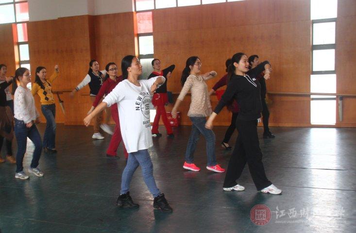 为了深入开展“中国梦、劳动美”教育实践活动,引导广大教职工践行“富强、民主、文明、和谐,自由、平等、公正、法治,爱国、敬业、诚信、友善”的社会主义核心价值观,关心教职工身心健康,丰富职工精神文化。根据省教育工会要求,4月27日下午,江西财经大学在蛟桥园南区大学生活动中心一楼舞蹈房举行“社会主义核心价值观工间操”培训。校属分工会积极派教职工参加培训,培训由体育学院教师、校女工委委员刘璇老师负责。刘老师为方便大家学习,把工间操的动作分解成日常生活的场景,如拉纤、切菜、招呼回家吃饭等等,经过大家积极的练习,学员们很快掌握了基本动作。为加强教职工熟练掌握,将连续进行多次培训。