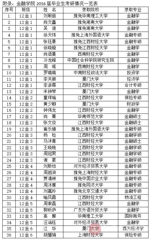 2016年4月,全国高校研究生录取结果陆续公布,江西财经大学金融学院12栋216寝室的四个女生均成功考上硕士研究生,其中肖语曼以初试成绩第一和复试综合成绩第一考上了西南财经大学证券与期货学院的金融学研究生,周瑶以复试综合成绩第一考上了西南财经大学金融学院金融学研究生,罗璐璐和王晓艳也以优异的成绩分别被中南财经政法大学投资学专业和江西财经大学的金融学专业录取,喜报频传让这个寝室充满着欢声笑语。