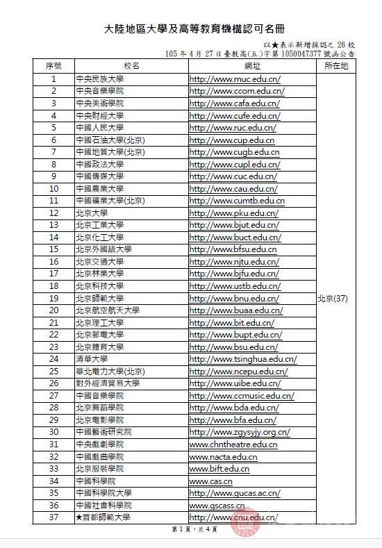 附件:台湾地区教育主管部门采认大陆地区高等学校名册